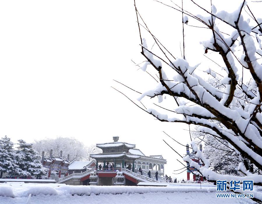 12月16日,人們?cè)谔靿珗@觀賞雪景。當(dāng)日,北京迎來降雪天氣。新華社記者鞠煥宗攝