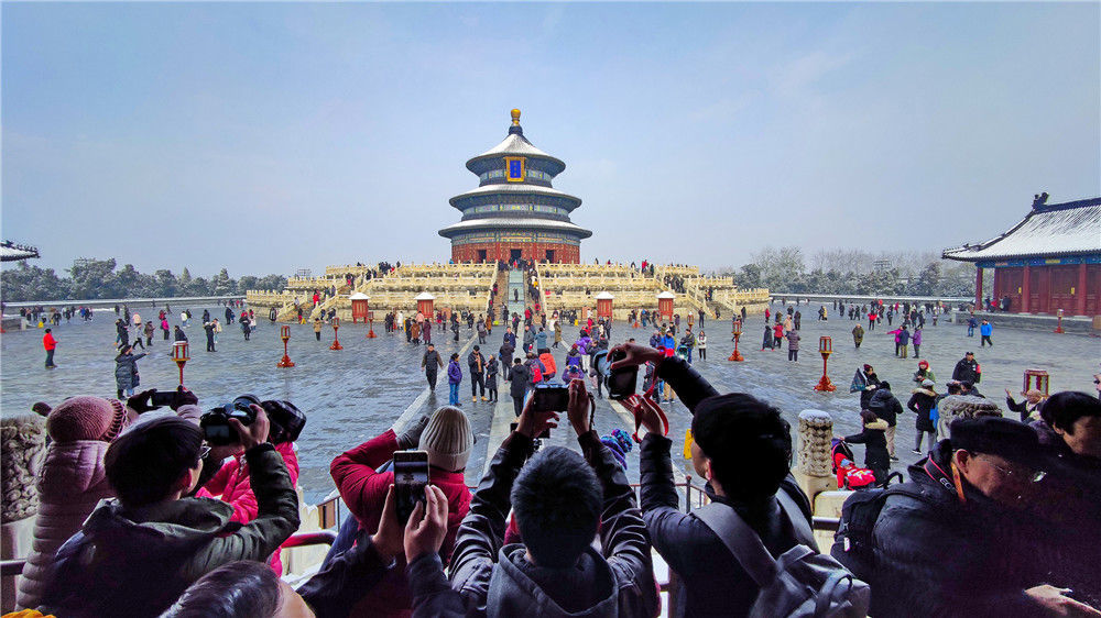 2019年11月30日,北京,天壇公園里觀雪賞景的市民絡(luò)繹不絕。喬?。垐D像/視覺中國(guó)