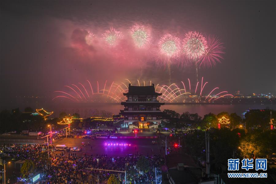 2020年1月1日晚,市民和游客在湖南長沙杜甫江閣前觀看焰火晚會(huì)。 當(dāng)晚,湖南長沙在橘子洲舉行音樂焰火晚會(huì)慶祝元旦,吸引眾多市民和游客前往觀看。 新華社記者 陳澤國 攝