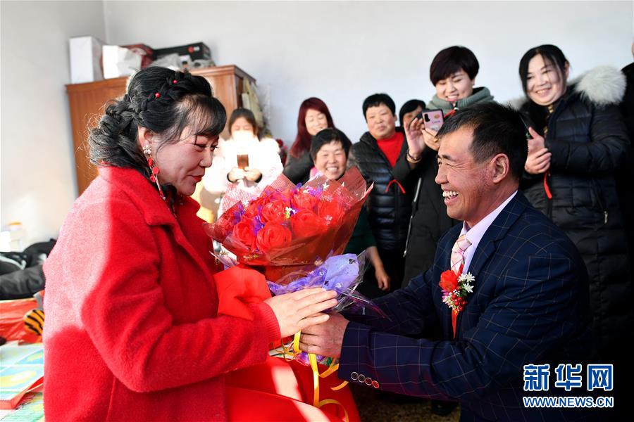 在和順縣李陽鎮(zhèn)南李陽村,新郎馬愛明將花送給新娘溫麗芳(2019年12月31日攝)。 農(nóng)歷臘月初六,是山西省和順縣李陽鎮(zhèn)下石勒村45歲的馬愛明娶媳婦的日子。 地處太行山區(qū)的下石勒村曾深陷貧困,“地下無資源、地上沒產(chǎn)業(yè)”是這里的真實(shí)寫照。2013年,村里638口人中有511口屬貧困人口。村民在貧瘠的坡地上種的玉米、谷子等僅夠糊口,外村女子都不愿嫁到這里。和村里多數(shù)人一樣,貧困戶馬愛明不得不在農(nóng)閑時(shí)出去打工補(bǔ)貼家用。東走走、西走走,馬愛明沒攢下錢,也沒遇見合適的人,婚事一拖再拖,成了大齡“光棍”。 2013年以來,在國家強(qiáng)有力的政策幫扶和基層黨組織的帶領(lǐng)下,下石勒村以合作社的形式發(fā)展起肉牛養(yǎng)殖、雙孢菇種植、萬壽菊種植等集體產(chǎn)業(yè)。下石勒村經(jīng)濟(jì)有了起色,外出打工的村民紛紛回村。馬愛明加入了村里的建筑隊(duì),閑時(shí)還到種植專業(yè)合作社打工,一年四季都有活干。加上土地流轉(zhuǎn)的收入,馬愛明一年能收入三萬多元。2016年,下石勒村實(shí)現(xiàn)整村脫貧。 2019年,馬愛明結(jié)識(shí)了在下石勒村肉雞養(yǎng)殖專業(yè)合作社打工的李陽鎮(zhèn)南李陽村村民溫麗芳,馬愛明的樸實(shí)、善良、勤勞打動(dòng)了溫麗芳,兩人擦出了愛情的火花。 臘月初六這天,下石勒村鑼鼓喧天,嗩吶齊鳴。在鄉(xiāng)親們的見證下,馬愛明手牽新娘,大聲宣布:“我脫單了!我的幸福生活開始了!” 新華社記者 詹彥 攝