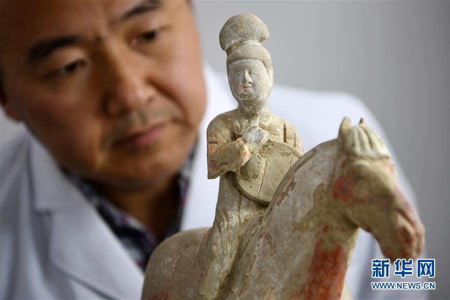 2019年12月27日,在天水市博物館文物保護(hù)修復(fù)中心陶、玉石器文物修復(fù)室,專業(yè)技術(shù)人員孟旭輝在觀察一件唐代彩繪陶俑的病害情況。 甘肅省天水市博物館文物保護(hù)修復(fù)中心有一支專業(yè)的文物修復(fù)隊(duì)伍,共有14名專業(yè)技術(shù)人員。從2012年正式成立以來,他們不僅承擔(dān)著對(duì)館藏和館外文物的修復(fù)工作,還參與了多次文化遺存的調(diào)查和搶救性發(fā)掘、古建筑彩畫保護(hù)、古墓葬搬遷復(fù)原等工作。一件件殘缺破損、滿身病害的文物經(jīng)過他們的巧手修復(fù),又重新煥發(fā)光彩,展示在公眾面前。 新華社記者 馬寧 攝