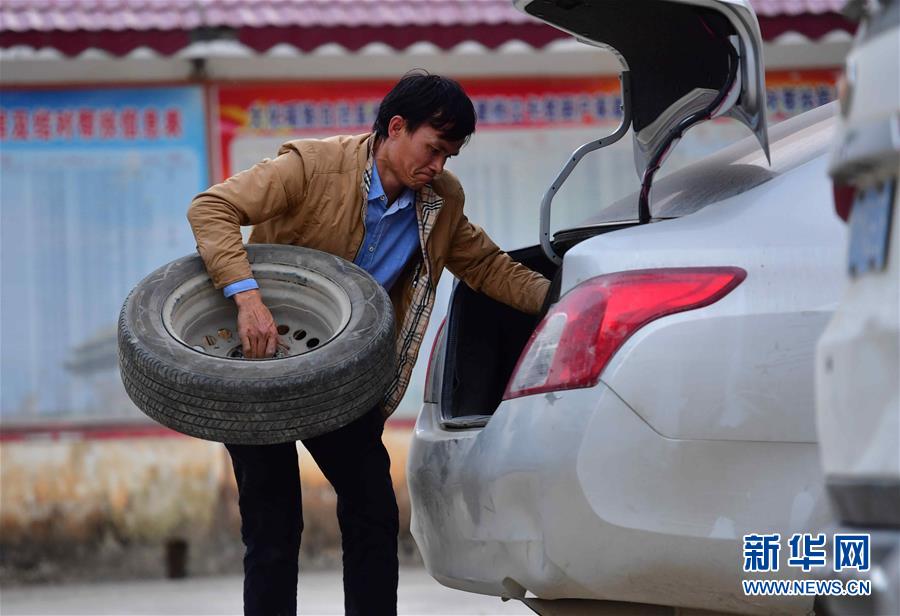 八好村駐村第一書(shū)記韋德王將汽車(chē)備胎放入后備箱(2019年12月16日攝)。新華社記者黃孝邦攝