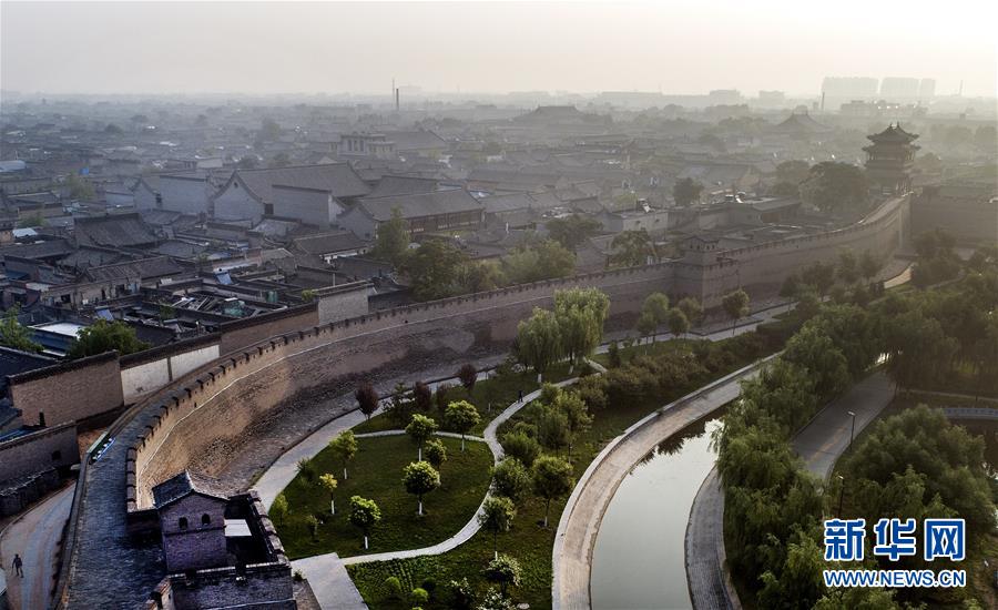 這是7月20日無(wú)人機(jī)拍攝的平遙古城墻與護(hù)城河。平遙古城城墻總周長(zhǎng)6163米,墻高約12米,把面積約2.25平方公里的平遙縣城隔為兩個(gè)風(fēng)格迥異的世界。城墻以內(nèi)街道、鋪面、市樓保留明清形制,城墻以外為新城。