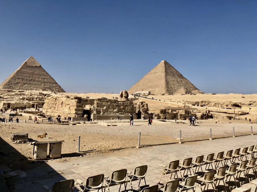 此像高20米,長(zhǎng)57米,算上兩個(gè)前爪,全長(zhǎng)72米。它頭戴“奈姆斯”皇冠,兩耳側(cè)有扇狀的“那姆斯”頭巾下垂,前額上刻著圣蛇浮雕,下頜有帝王的標(biāo)志,下垂的長(zhǎng)須,脖子上圍著項(xiàng)圈,鷹的羽毛圖案打扮著獅身。孫衛(wèi)南攝