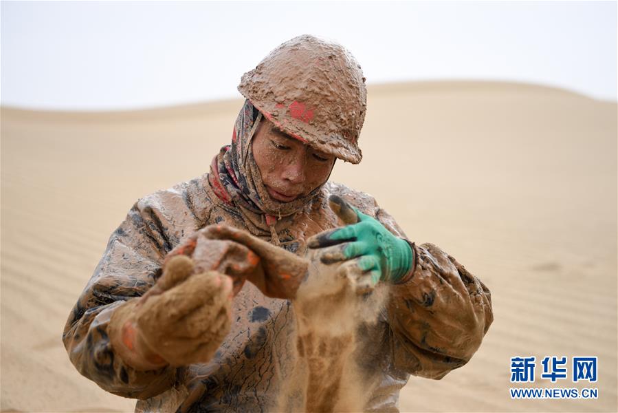 1月13日,鉆井工潘洪星用沙子帶出手套里的泥水。地球物理勘探是油氣開(kāi)發(fā)的第一步,相當(dāng)于給地球做CT。物探工人按照嚴(yán)格的測(cè)線(xiàn)部署,在相應(yīng)位置鉆井,然后實(shí)施地震,采集地震波數(shù)據(jù)??蒲腥藛T通過(guò)數(shù)據(jù)組成的“CT片”,就能夠清晰地“看”到地下的地質(zhì)結(jié)構(gòu),判斷哪里埋藏有石油或者天然氣。2019年10月,東方地球物理勘探有限責(zé)任公司塔里木物探處2113隊(duì)進(jìn)入新疆塔克拉瑪干沙漠腹地,開(kāi)始中古14-21、塔中2兩個(gè)區(qū)塊的三維地震勘探。近2000名物探工人將在1000平方公里的范圍內(nèi)一直工作到2020年4月,這也意味著他們將在塔克拉瑪干沙漠腹地連續(xù)度過(guò)第14個(gè)除夕夜。蘊(yùn)藏著豐富石油天然氣資源的新疆塔克拉瑪干沙漠有“死亡之?!敝Q(chēng),氣候干燥,年降水量在50毫米以下,冬季地表最低溫度超過(guò)零下30攝氏度,是世界油氣勘探難度最大的地區(qū)之一。為避開(kāi)風(fēng)季,物探工人每年9、10月份進(jìn)入沙漠,一直工作到來(lái)年4月,夜以繼日與黃沙、嚴(yán)寒為伴,用辛勤的汗水,為祖國(guó)找油找氣。新華社記者丁磊攝