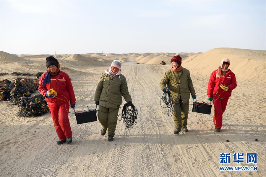 1月14日,4名測線女工抬著電瓶返回營地。地球物理勘探是油氣開發(fā)的第一步,相當(dāng)于給地球做CT。物探工人按照嚴(yán)格的測線部署,在相應(yīng)位置鉆井,然后實(shí)施地震,采集地震波數(shù)據(jù)??蒲腥藛T通過數(shù)據(jù)組成的“CT片”,就能夠清晰地“看”到地下的地質(zhì)結(jié)構(gòu),判斷哪里埋藏有石油或者天然氣。2019年10月,東方地球物理勘探有限責(zé)任公司塔里木物探處2113隊(duì)進(jìn)入新疆塔克拉瑪干沙漠腹地,開始中古14-21、塔中2兩個(gè)區(qū)塊的三維地震勘探。近2000名物探工人將在1000平方公里的范圍內(nèi)一直工作到2020年4月,這也意味著他們將在塔克拉瑪干沙漠腹地連續(xù)度過第14個(gè)除夕夜。蘊(yùn)藏著豐富石油天然氣資源的新疆塔克拉瑪干沙漠有“死亡之?!敝Q,氣候干燥,年降水量在50毫米以下,冬季地表最低溫度超過零下30攝氏度,是世界油氣勘探難度最大的地區(qū)之一。為避開風(fēng)季,物探工人每年9、10月份進(jìn)入沙漠,一直工作到來年4月,夜以繼日與黃沙、嚴(yán)寒為伴,用辛勤的汗水,為祖國找油找氣。新華社記者丁磊攝