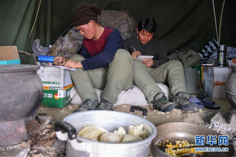 1月14日,查線工在吃飯間隙收聽(tīng)電臺(tái)里報(bào)出的不正常道樁號(hào),并記錄在本子上。地球物理勘探是油氣開(kāi)發(fā)的第一步,相當(dāng)于給地球做CT。物探工人按照嚴(yán)格的測(cè)線部署,在相應(yīng)位置鉆井,然后實(shí)施地震,采集地震波數(shù)據(jù)??蒲腥藛T通過(guò)數(shù)據(jù)組成的“CT片”,就能夠清晰地“看”到地下的地質(zhì)結(jié)構(gòu),判斷哪里埋藏有石油或者天然氣。2019年10月,東方地球物理勘探有限責(zé)任公司塔里木物探處2113隊(duì)進(jìn)入新疆塔克拉瑪干沙漠腹地,開(kāi)始中古14-21、塔中2兩個(gè)區(qū)塊的三維地震勘探。近2000名物探工人將在1000平方公里的范圍內(nèi)一直工作到2020年4月,這也意味著他們將在塔克拉瑪干沙漠腹地連續(xù)度過(guò)第14個(gè)除夕夜。蘊(yùn)藏著豐富石油天然氣資源的新疆塔克拉瑪干沙漠有“死亡之?!敝Q,氣候干燥,年降水量在50毫米以下,冬季地表最低溫度超過(guò)零下30攝氏度,是世界油氣勘探難度最大的地區(qū)之一。為避開(kāi)風(fēng)季,物探工人每年9、10月份進(jìn)入沙漠,一直工作到來(lái)年4月,夜以繼日與黃沙、嚴(yán)寒為伴,用辛勤的汗水,為祖國(guó)找油找氣。新華社記者丁磊攝