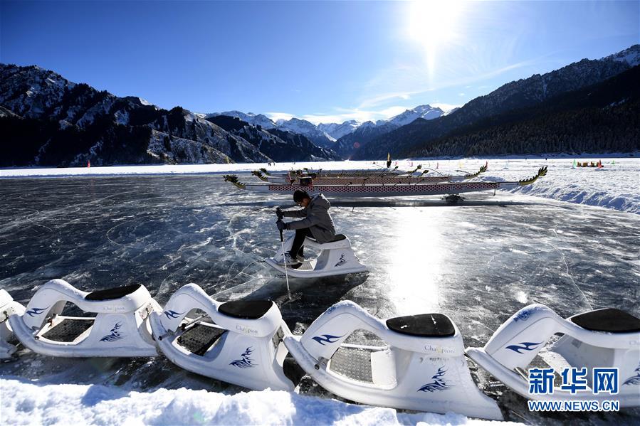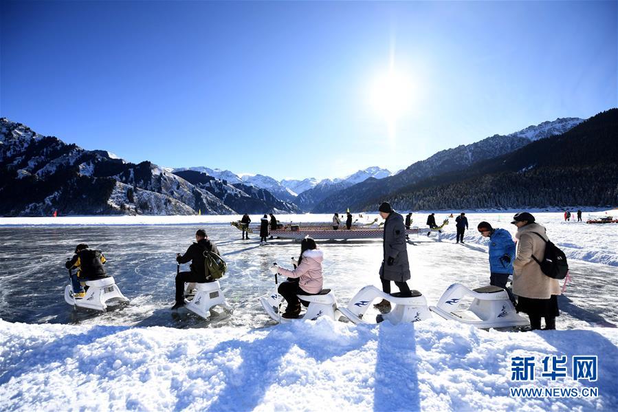 1月18日,游客在新疆天池景區(qū)玩冰上龍舟。新華社記者 沙達(dá)提 攝