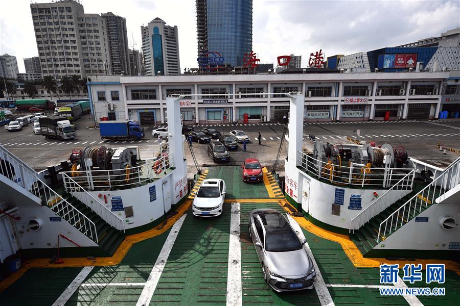 1月19日,車(chē)輛在??谛阌⒏圯喍纱a頭登船。 新華社記者 郭程 攝
