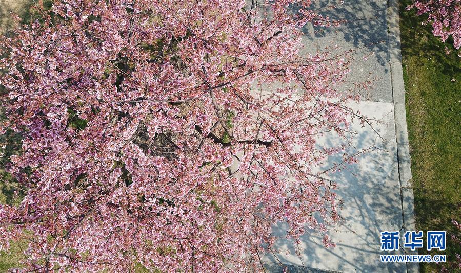 這是2月24日在上海松江辰山植物園內(nèi)拍攝的河津櫻(無(wú)人機(jī)照片)。 新華社記者 方喆 攝