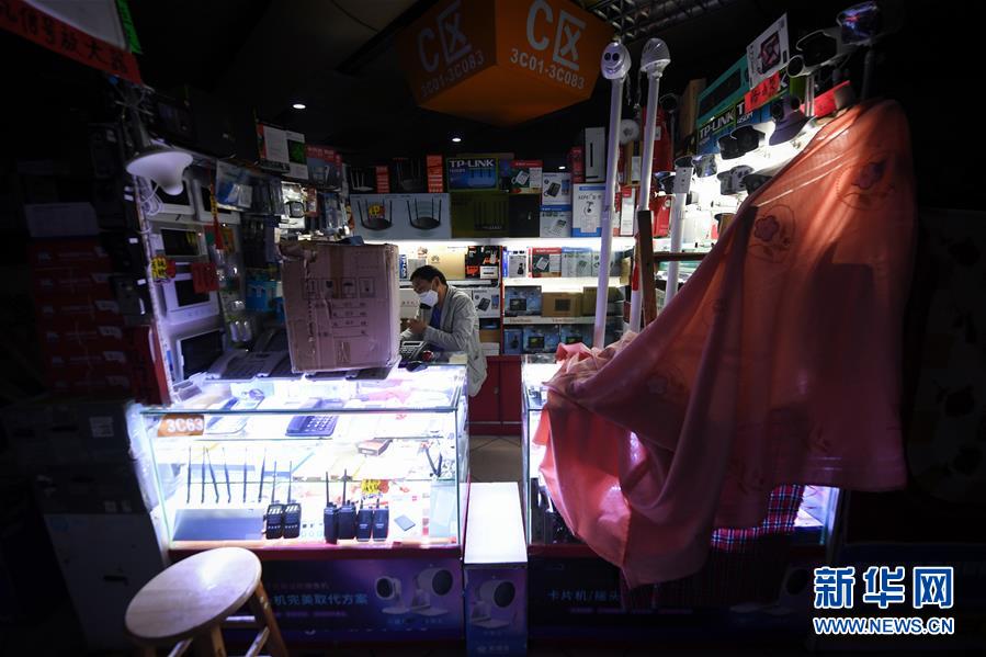 2月24日,在深圳華強北暫未完全開放的賽格電子市場里,商戶在與客戶打電話。 新華社記者 毛思倩 攝