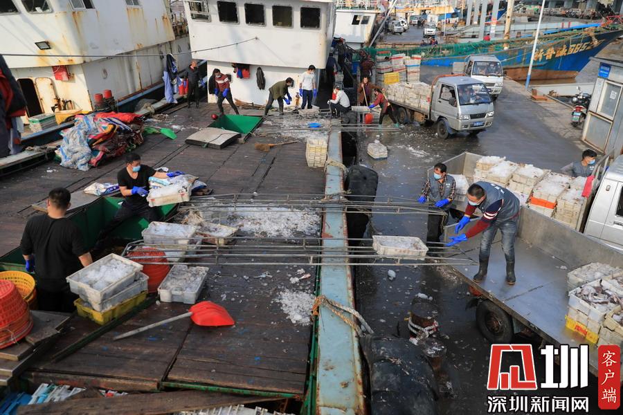 2020年2月24日,浙江舟山國際水產(chǎn)城碼頭,當(dāng)?shù)氐墓と苏趧偪堪兜臐O船上卸魚貨,現(xiàn)場十分繁忙。