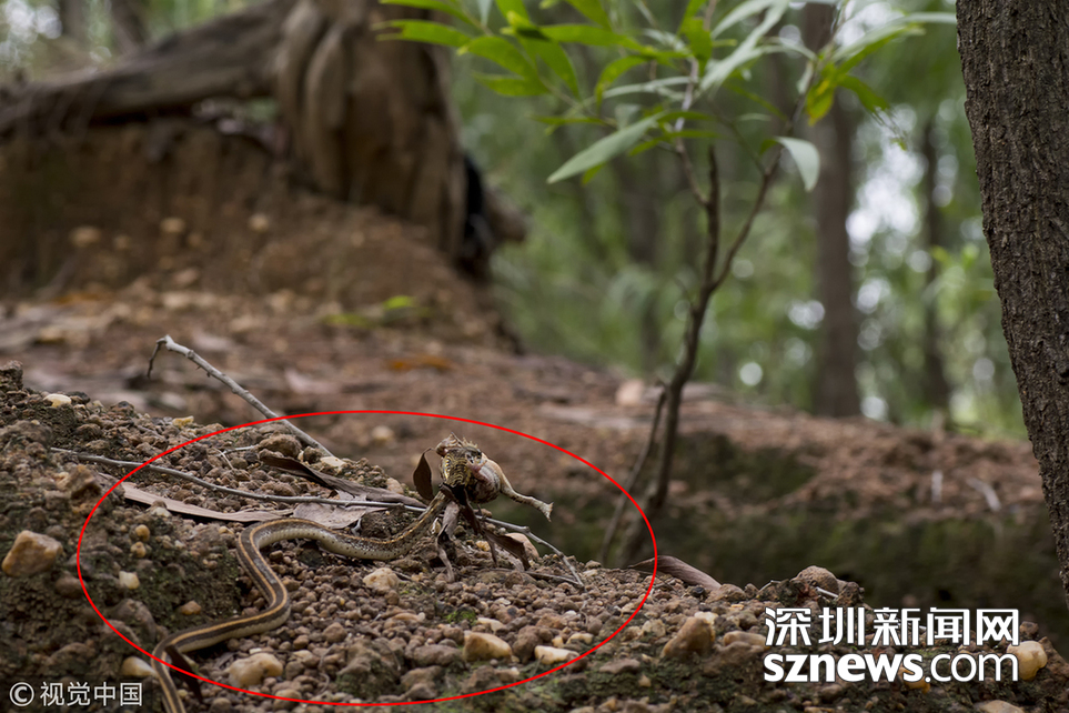 印度加爾各答B(yǎng)olpar,業(yè)余攝影師Agniswar Ghosal在Bolpar散步時(shí)拍到蛇大口吞咽蟾蜍的震撼場(chǎng)景。一條細(xì)長(zhǎng)的蛇正試圖整個(gè)吞下一只大蟾蜍,蟾蜍的頭已經(jīng)進(jìn)了蛇口,大半截身體還在外邊。這條野心勃勃的蛇把這只毫無戒心的蟾蜍從洞里拖了出來,然后溜進(jìn)灌木叢,安靜地享用晚餐。