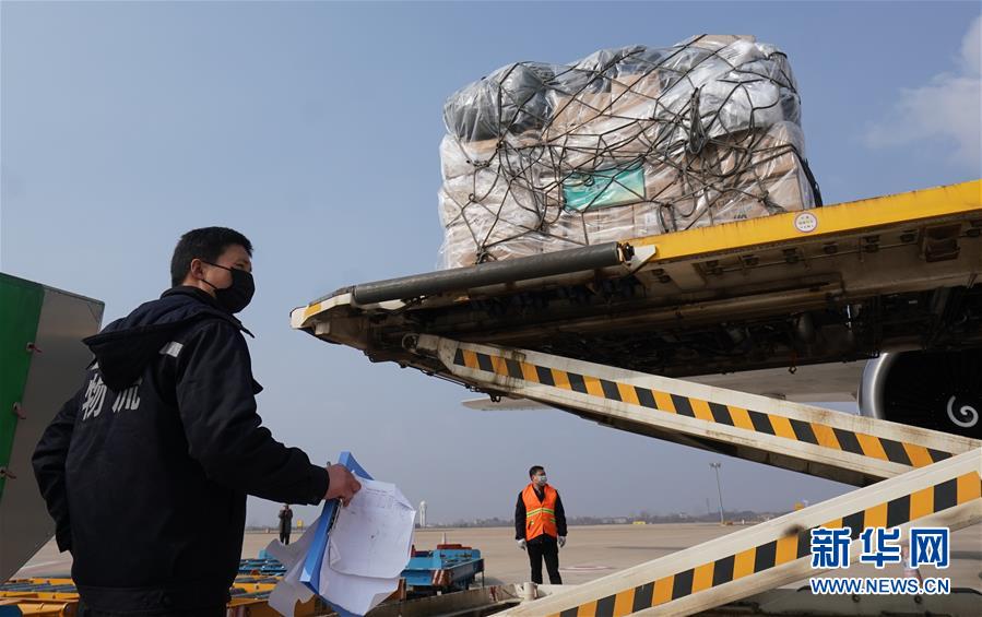 1月28日,滿載醫(yī)療防疫物資的貨運(yùn)飛機(jī)在武漢天河機(jī)場卸貨。新華社記者 程敏 攝