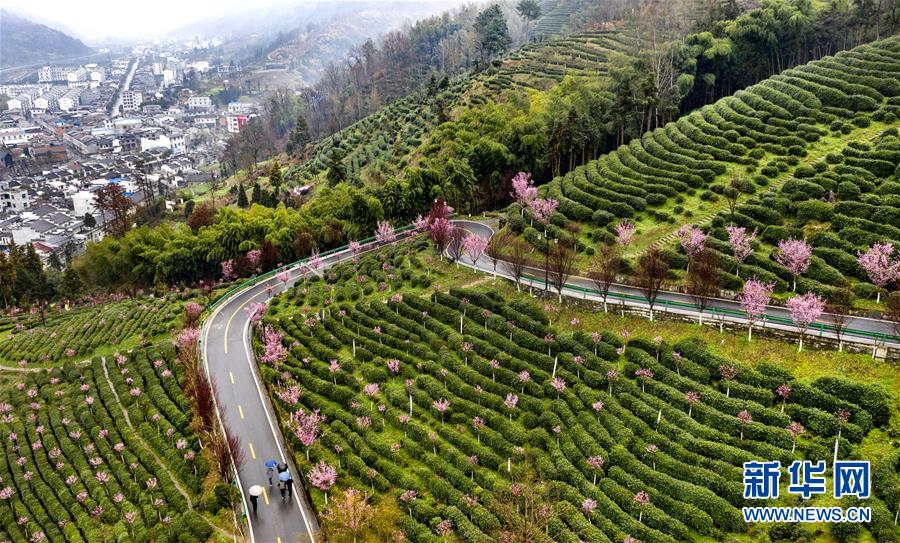 3月2日,游人在春雨中游覽平利縣長(zhǎng)安鎮(zhèn)洪福茶山(無人機(jī)照片)。新華社記者陶明攝