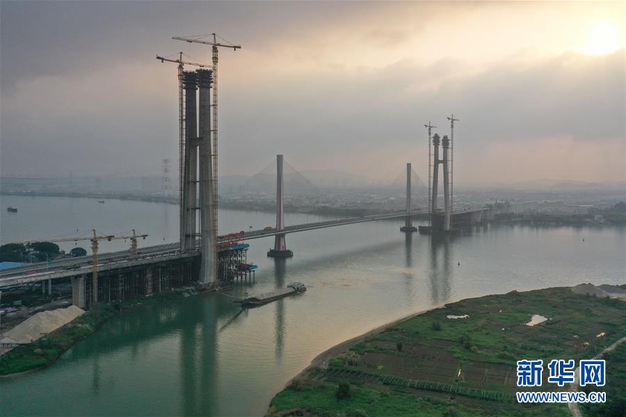 廣州南沙港鐵路跨西江斜拉橋主塔封頂