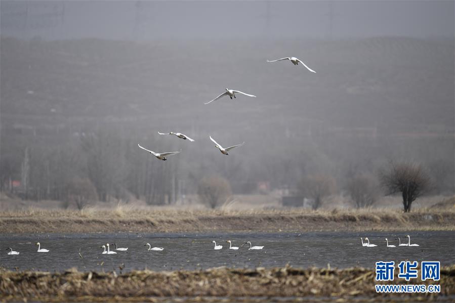 3月18日,候鳥在準(zhǔn)格爾旗大路鎮(zhèn)的黃河淺灘上起飛。 新華社記者 于嘉 攝