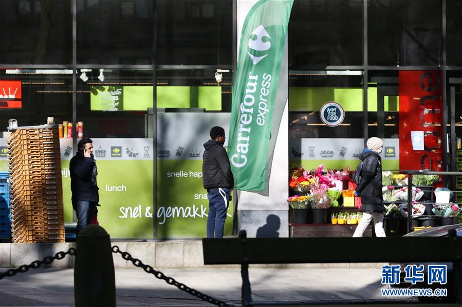 3月18日,在比利時(shí)布魯塞爾,顧客排隊(duì)等待進(jìn)入超市購物。 新華社記者 張鋮 攝