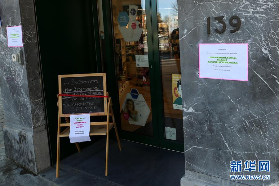 3月18日,在比利時(shí)布魯塞爾,一家藥店張貼的說明提示最多容納2名顧客同時(shí)進(jìn)入。 新華社記者 張鋮 攝