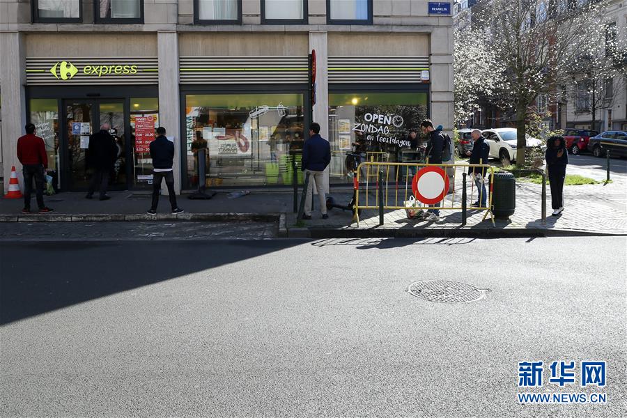 3月18日,在比利時(shí)布魯塞爾,顧客排隊(duì)等待進(jìn)入超市購物。 新華社記者 張鋮 攝