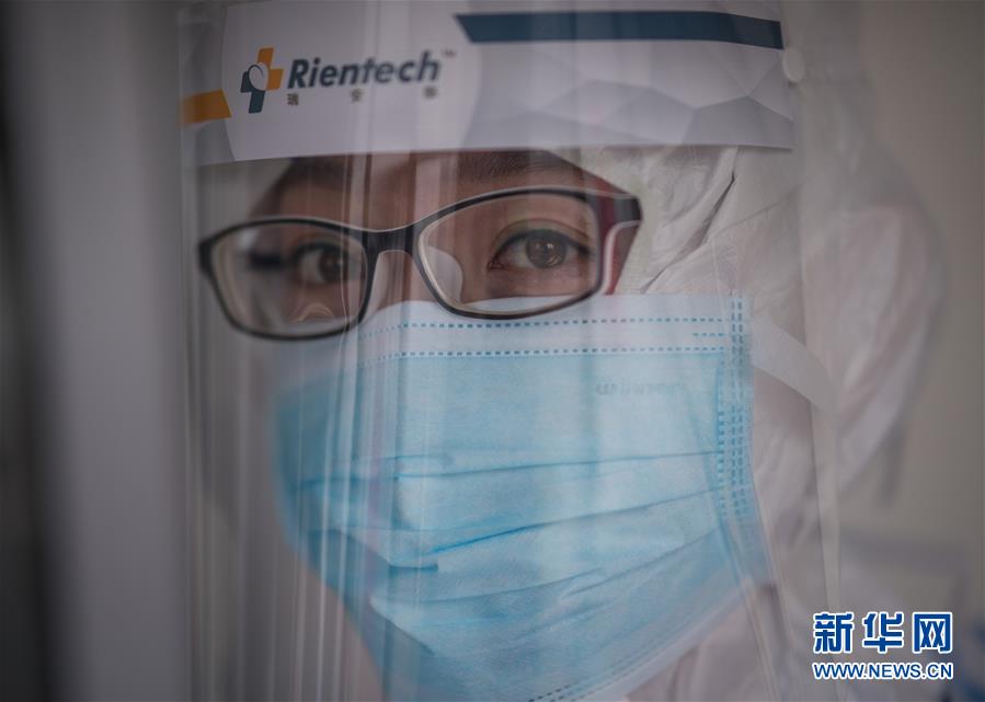 3月19日,在武漢市肺科醫(yī)院隔離病房,內(nèi)蒙古醫(yī)療隊(duì)隊(duì)員在工作中。 新華社記者 肖藝九 攝