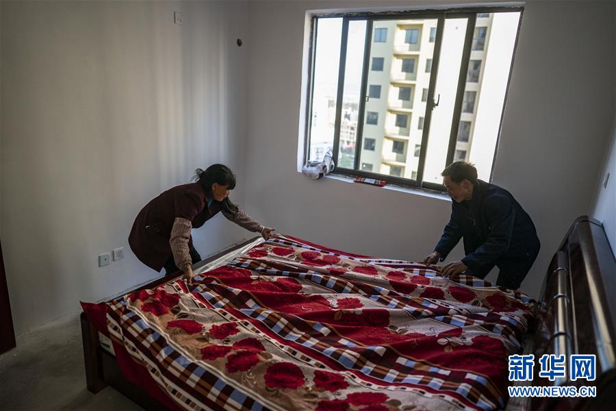 王大香和丈夫晏付高在新家鋪床(3月15日攝)。 新華社記者 江文耀 攝