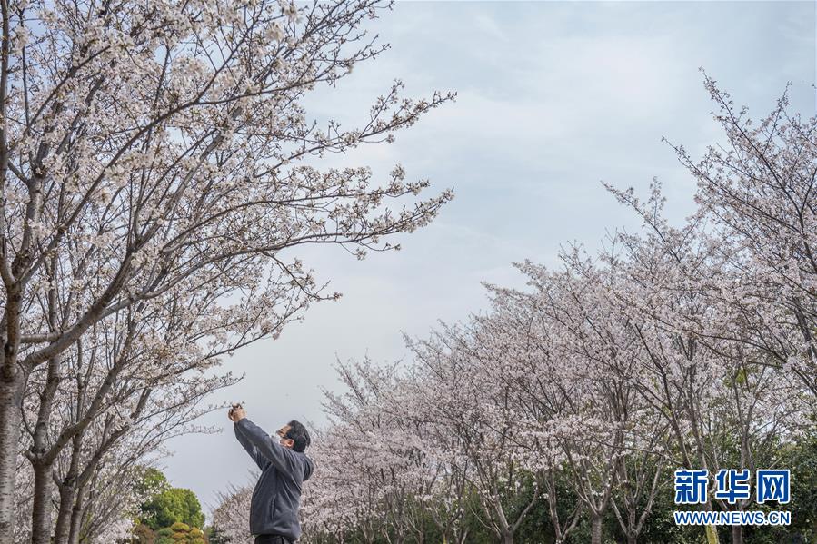 3月19日,在武漢市武昌區(qū)被網(wǎng)友稱為“武漢最美停車場”的湖北日報停車場,一名工作人員在拍攝櫻花。 新華社記者 才揚 攝