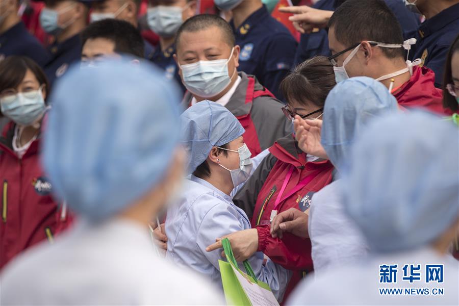 3月21日,武漢市第一醫(yī)院的護(hù)士長(zhǎng)杜沛(中左一)與天津市醫(yī)療隊(duì)隊(duì)員道別。杜沛是負(fù)責(zé)與天津市醫(yī)療隊(duì)對(duì)接的護(hù)士長(zhǎng)。新華社記者費(fèi)茂華攝