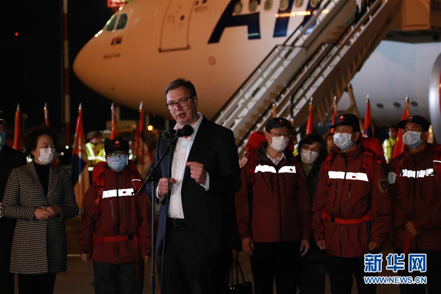 3月21日,在塞爾維亞首都貝爾格萊德,塞爾維亞總統(tǒng)武契奇在歡迎中國援助塞爾維亞抗疫醫(yī)療專家組的儀式上致辭。 中國援助塞爾維亞抗疫醫(yī)療專家組一行6人21日晚乘專機(jī)抵達(dá)塞首都貝爾格萊德,由中國政府捐贈(zèng)的一批醫(yī)療物資同機(jī)抵達(dá)。 新華社記者 石中玉 攝