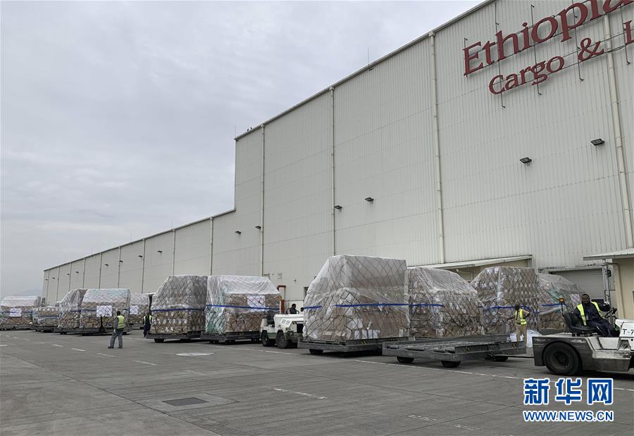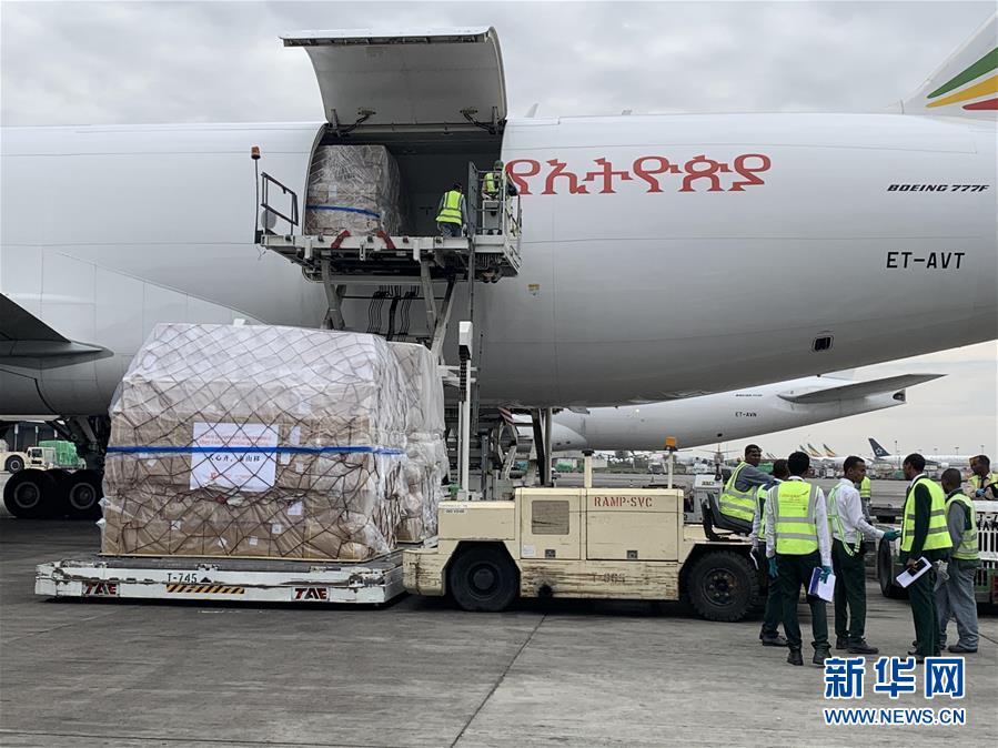 3月22日,在埃塞俄比亞首都亞的斯亞貝巴國際機(jī)場(chǎng),工作人員將中國援助的抗疫物資運(yùn)下飛機(jī)。歷時(shí)10小時(shí)飛行,滿載著來自中國抗疫物資的埃航貨運(yùn)包機(jī)22日上午抵達(dá)埃塞俄比亞首都亞的斯亞貝巴的國際機(jī)場(chǎng),這是馬云公益基金會(huì)和阿里巴巴公益基金會(huì)捐贈(zèng)非洲的部分醫(yī)療物資,用于支援非洲54國抗擊疫情。新華社記者王守寶攝