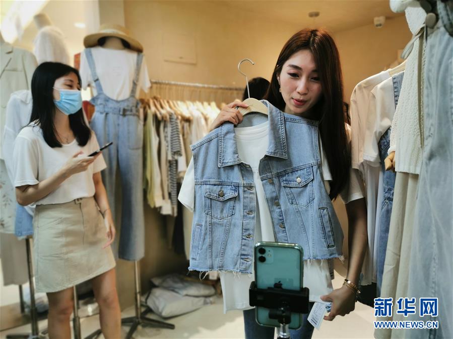在廣州市新中國(guó)大廈內(nèi),一家服裝檔口的員工在用手機(jī)進(jìn)行直播(3月21日攝)。新華社記者胡林果攝