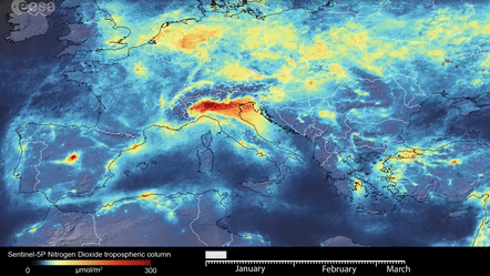 動圖說明:歐洲航天局衛(wèi)星日前監(jiān)測到,疫情期間意大利二氧化氮等污染氣體排放量明顯下降(衛(wèi)星:Sentinel-5P)。衛(wèi)星攜帶的各類傳感器能夠采集空氣中懸浮物顆粒的電磁波信號,從而對空氣質(zhì)量做出分析判斷。圖中的黃色代表二氧化氮等污染氣體的濃度。