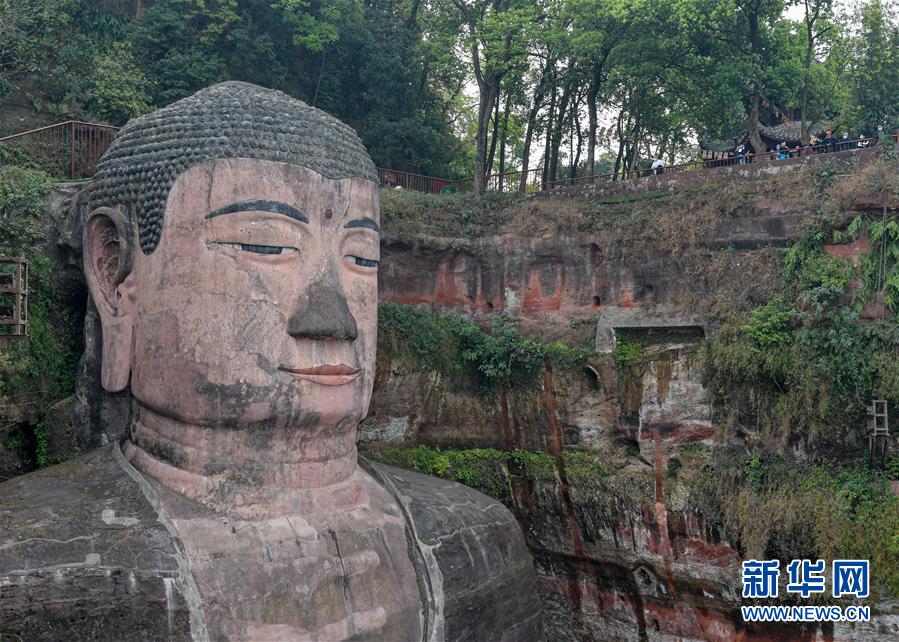 3月23日,游客在樂(lè)山大佛景區(qū)內(nèi)游覽。新華社記者張超群攝