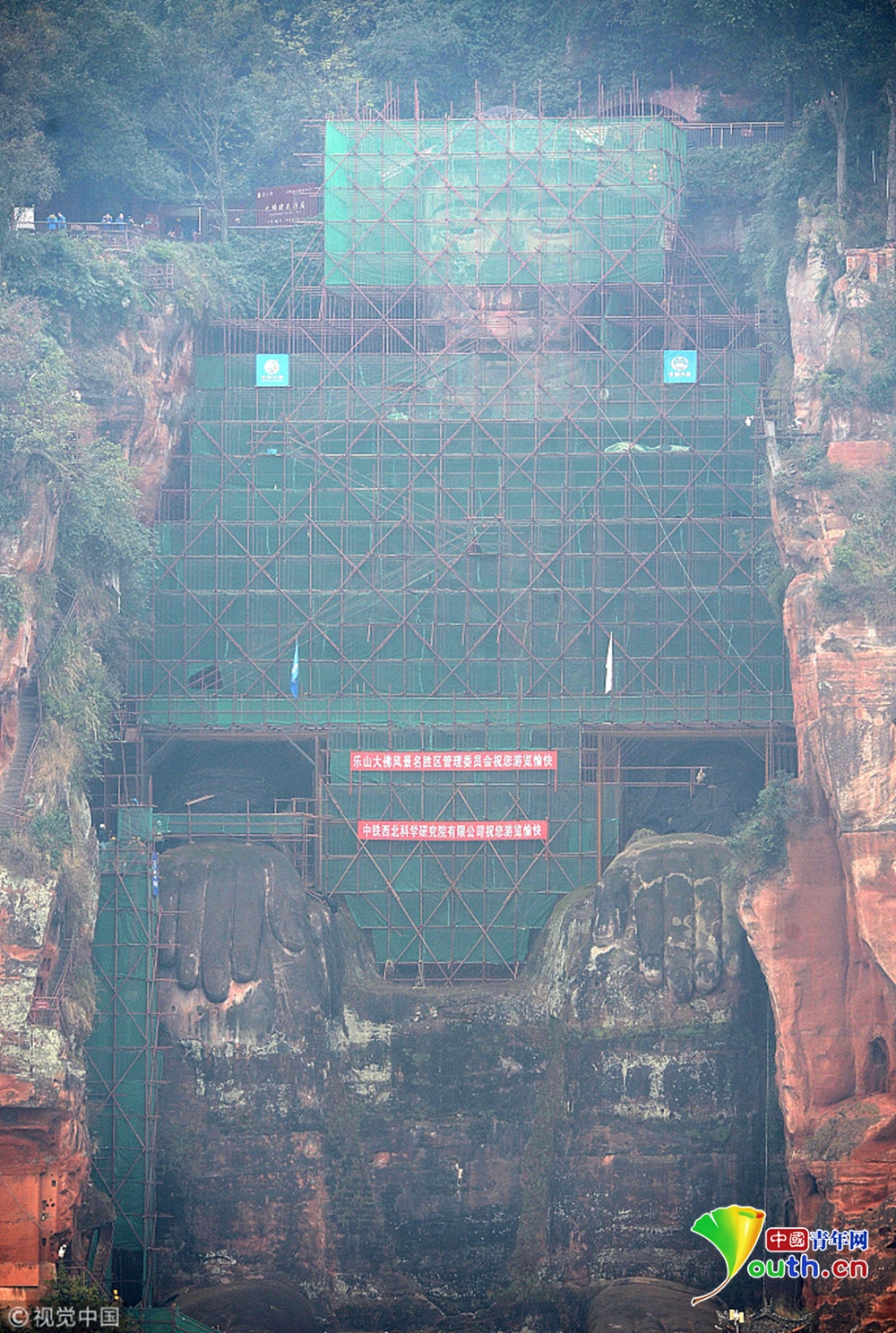 據(jù)大佛體檢項目負(fù)責(zé)人、中鐵西北科學(xué)研究院文保中心副主任孫博介紹說:主要是前期修繕材料出現(xiàn)耐久性問題,造成胸腹部起鼓、開裂、剝落。因?yàn)榇蠓鹬黧w結(jié)構(gòu)從上到下整體是砂巖結(jié)構(gòu),但不同的砂巖層之間又有30厘米至50厘米厚的泥巖夾層,泥巖則相對較弱,那么泥巖夾層就變成了相對的隔水層。