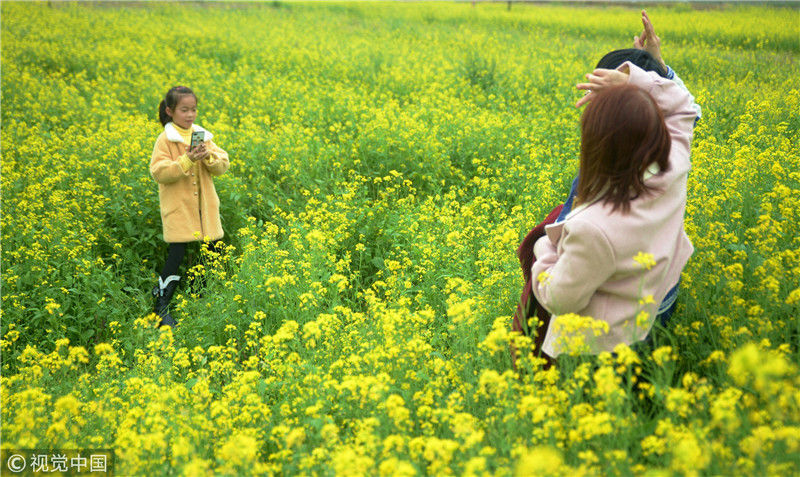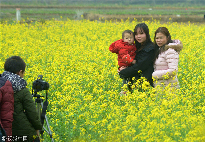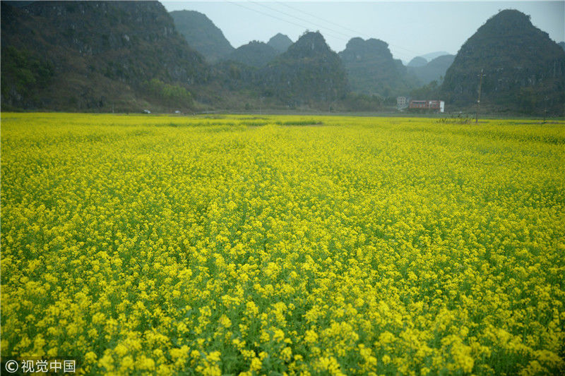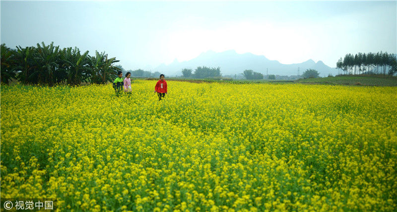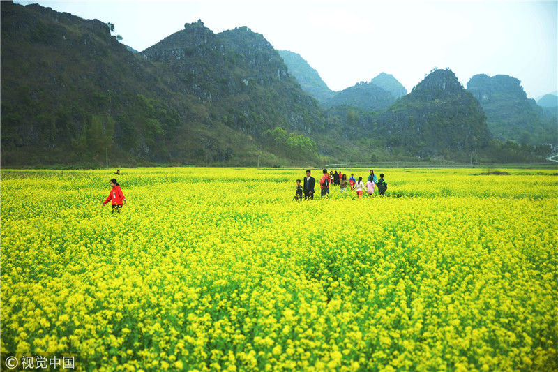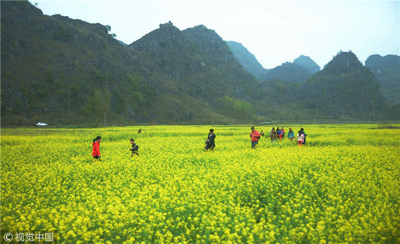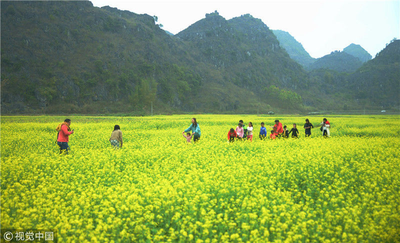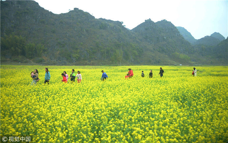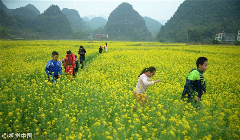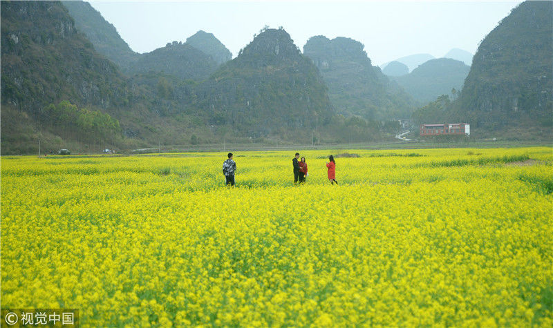 2019年2月5日,春節(jié)期間,廣西來賓市忻城縣萬余畝油菜花競相綻放,吸引眾多游客前來賞花游玩,感受春天的氣息。近年來,廣西忻城縣大力實(shí)施鄉(xiāng)村振興戰(zhàn)略,注重發(fā)展鄉(xiāng)村旅游產(chǎn)業(yè),把鄉(xiāng)村旅游與美麗鄉(xiāng)村、脫貧攻堅(jiān)緊密結(jié)合起來,輻射帶動(dòng)當(dāng)?shù)刎毨裘撠氈赂弧7B光/視覺中國