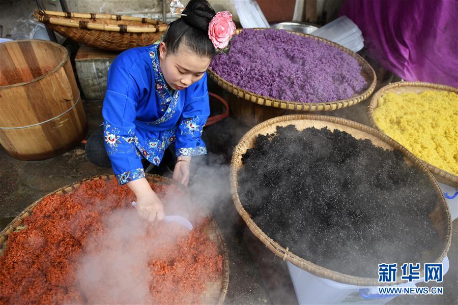 4月17日,在貴州省臺(tái)江縣姊妹街哆蝶五彩姊妹飯?bào)w驗(yàn)店,苗家婦女在攤晾五彩“姊妹飯”。新華社記者楊文斌攝