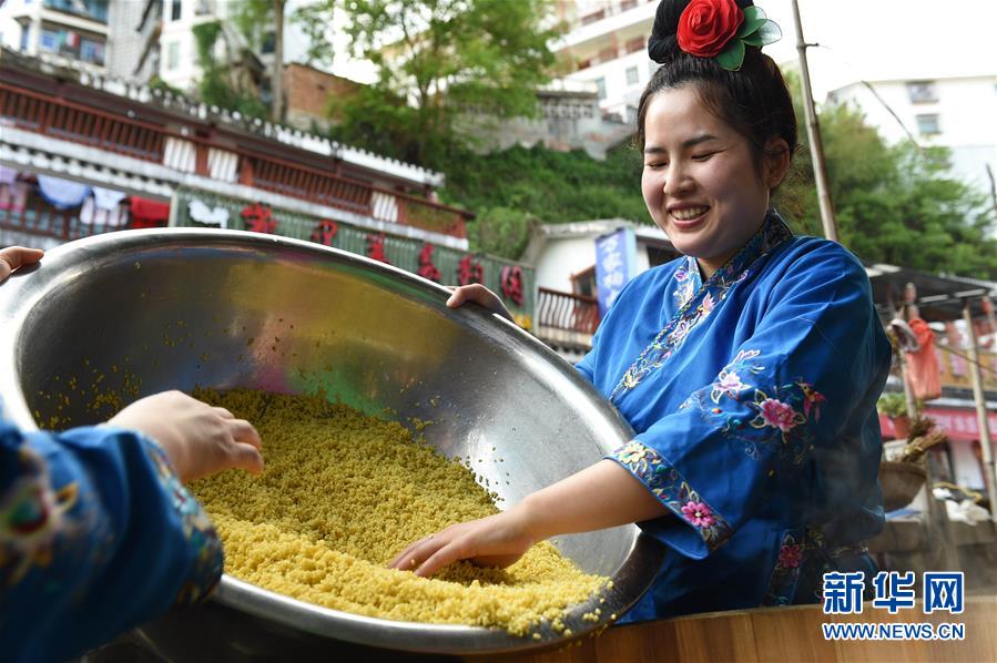 4月16日,在貴州省臺(tái)江縣姊妹街哆蝶五彩姊妹飯?bào)w驗(yàn)店,苗家婦女在制作五彩“姊妹飯”。新華社發(fā)(劉開(kāi)福攝)