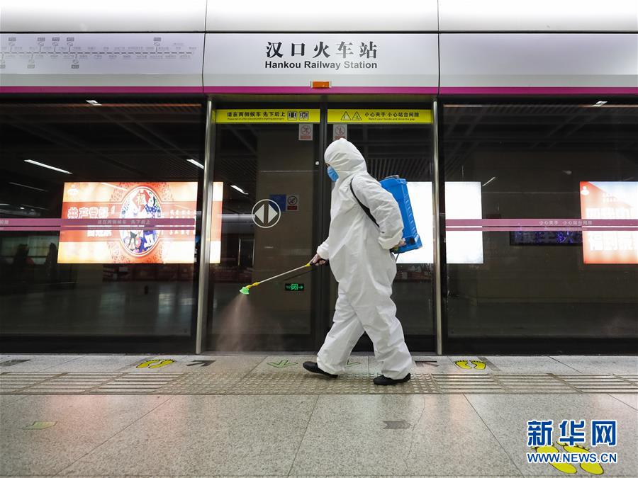 3月23日,在漢口火車站地鐵站,保潔人員在為站臺(tái)消毒。新華社記者沈伯韓攝