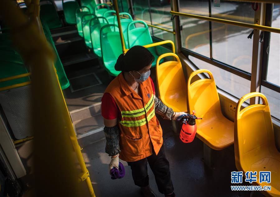 3月23日,武漢公交集團(tuán)站務(wù)公司保潔員趙真香在為一輛公共汽車(chē)消毒清洗。新華社記者肖藝九攝