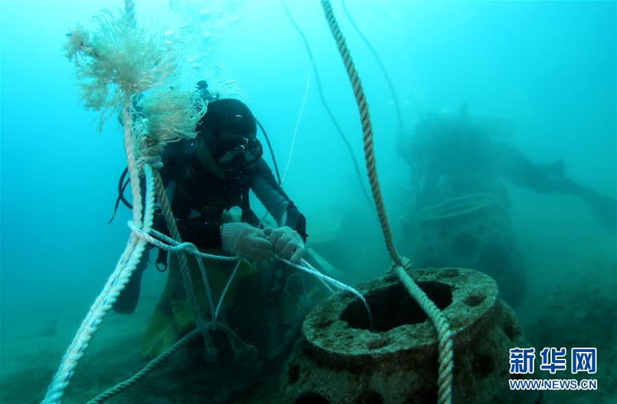 3月28日,在位于海南三亞蜈支洲島旅游區(qū)的海洋牧場,工作人員在海底用繩子綁住人工魚礁,準備進行吊裝擺位作業(yè)。近日,位于海南三亞蜈支洲島旅游區(qū)的海洋牧場復工,海底作業(yè)逐漸恢復正常,開始進行人工魚礁吊裝擺位、水下監(jiān)控清理以及日常巡護等工作。據介紹,人工魚礁有利于魚類種類增加和數量提高,蜈支洲島海域海洋牧場人工魚礁表面附著珊瑚、貝類、藻類等生物種類達120余種。新華社記者楊冠宇攝