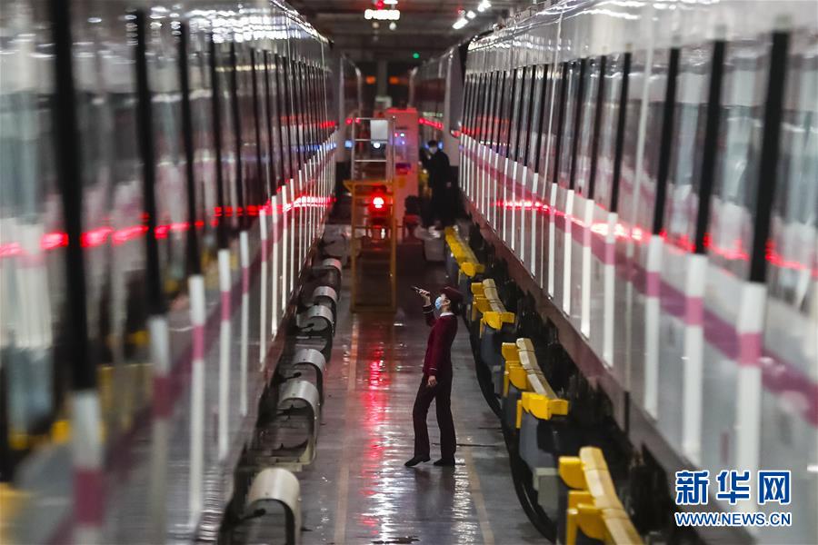 3月28日,武漢地鐵運營有限公司司機(jī)吳亞在常青車輛段巡視車輛內(nèi)部情況。新華社記者沈伯韓攝
