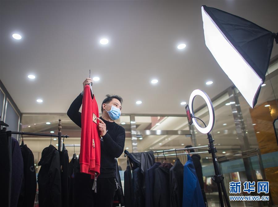 3月29日,在漢口北市場,主播在直播平臺直播銷售一款服裝。新華社記者肖藝九攝
