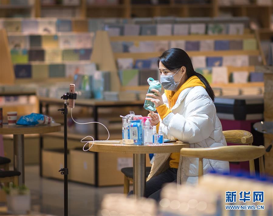 3月29日,在漢口北市場,一名主播在直播平臺直播銷售床上用品。新華社記者肖藝九攝