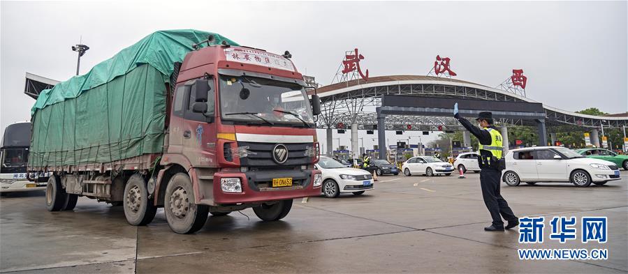 3月24日,在武漢西高速收費站交通卡點,執(zhí)勤民警陳鋼示意載有復(fù)工復(fù)產(chǎn)人員的大巴通行。新華社記者才揚攝