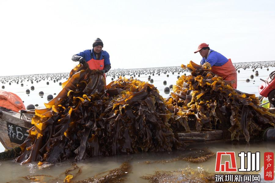 2020年3月29日,山東威海,榮成市愛連灣海水養(yǎng)殖區(qū)域,養(yǎng)殖工人開始收割海帶。