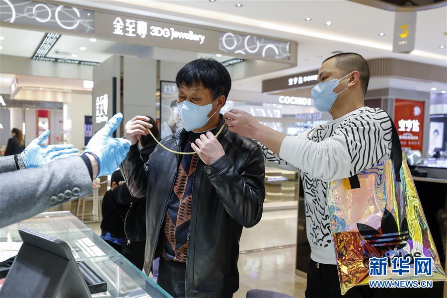3月30日,在武漢市武商世貿(mào)廣場,一名顧客(左)在挑選手鐲。當日,武漢市多家商場開門迎客。新華社記者沈伯韓攝