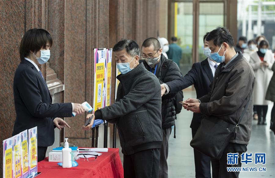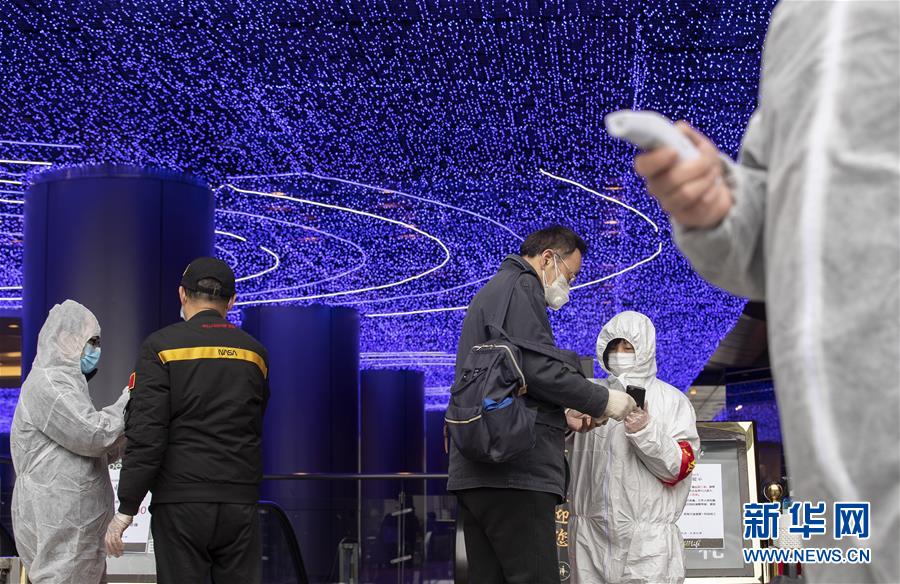 3月30日,在武商國際廣場的超市門口,工作人員在測量顧客的體溫。當日,武漢市多家商場開門迎客。新華社記者費茂華攝