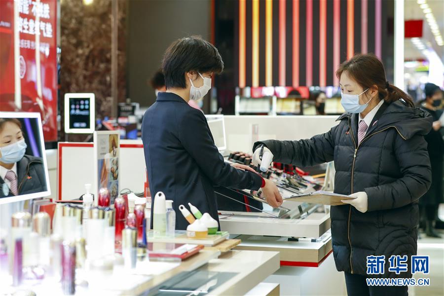 3月30日,在武漢市武商廣場,一名管理人員(右)在測量銷售人員的體溫。據(jù)了解,商場每兩小時就會測量一次所有銷售人員的體溫。當日,武漢市多家商場開門迎客。新華社記者沈伯韓攝