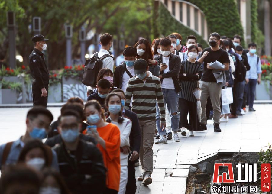 見圳客戶端·深圳新聞網(wǎng)2020年3月19日訊 下班時(shí)間,深圳地鐵一號(hào)線深大站A3出口外,下班后的市民在站外排大排長(zhǎng)龍,依次有序進(jìn)入地鐵站乘坐列車回家。