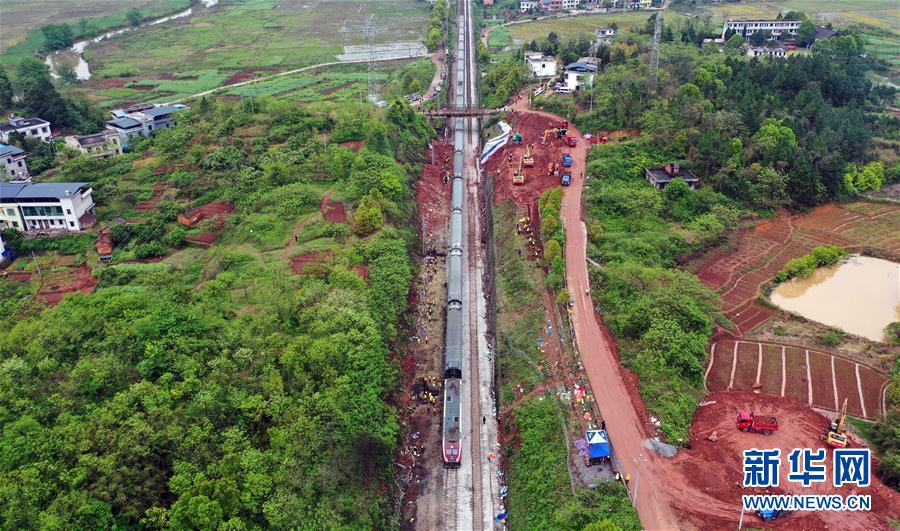 4月1日,Z201次旅客列車通過京廣鐵路郴州段脫軌事故區(qū)段(無人機(jī)照片)。新華社記者李尕?cái)z